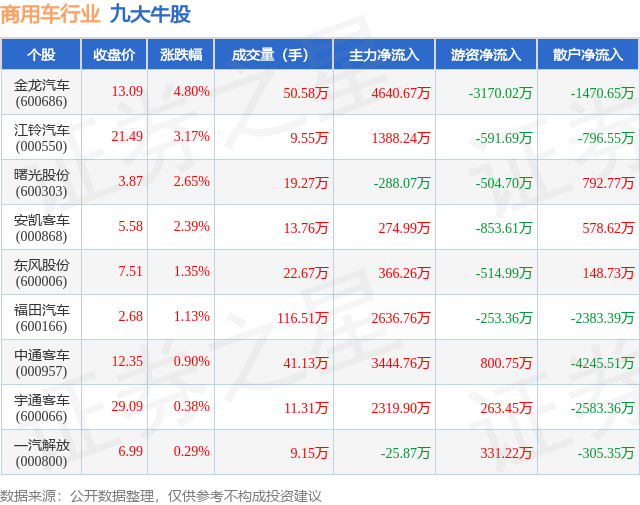 个股表现方面,商用车行业当日领涨股为金龙汽车(600686),该股当日报收13.09,上涨4.8%,成交量50.58万,主力资金净流入4640.67万元。江铃汽车(000550)以上涨3.17%紧随其后,该股当日成交量9.55万,主力资金净流入1388.24万元。除此之外,曙光股份(600303)、安凯客车(000868)、东风股份(600006)均进入当日牛股之列。具体个股列表见下表: