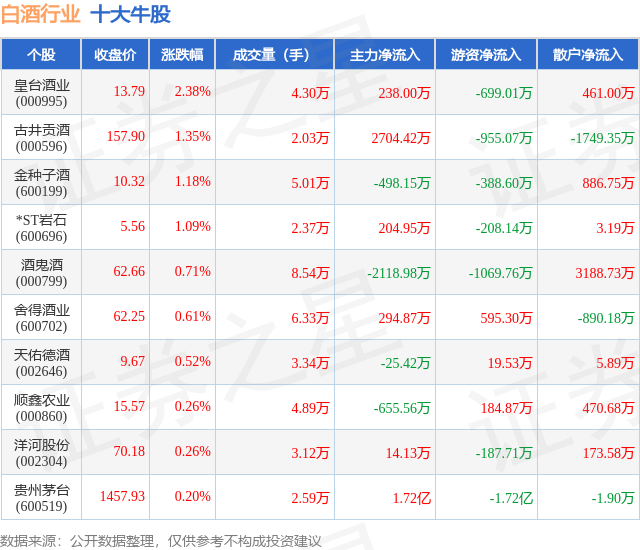 个股表现方面,白酒行业当日领涨股为皇台酒业(000995),该股当日报收13.79,上涨2.38%,成交量4.3万,主力资金净流入238.0万元。古井贡酒(000596)以上涨1.35%紧随其后,该股当日成交量2.03万,主力资金净流入2704.42万元。除此之外,金种子酒(600199)、*ST岩石(600696)、酒鬼酒(000799)均进入当日牛股之列。具体个股列表见下表: