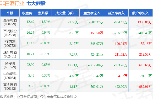 个股表现方面,非白酒行业当日领跌股为燕京啤酒(000729),该股当日报收12.49,下跌1.5%,成交量22.55万,主力资金净流出684.37万元。百润股份(002568)以下跌0.94%紧随其后,该股当日成交量8.7万,主力资金净流入1155.5万元。除此之外,ST西发(000752)、珠江啤酒(002461)、会稽山(601579)均进入当日熊股之列。具体个股列表见下表: