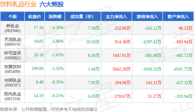 个股表现方面,饮料乳品行业当日领跌股为新乳业(002946),该股当日报收17.1,下跌4.36%,成交量7.3万,主力资金净流入252.89万元。天润乳业(600419)以下跌1.86%紧随其后,该股当日成交量10.5万,主力资金净流入914.38万元。除此之外,妙可蓝多(600882)、东鹏饮料(605499)、光明乳业(600597)均进入当日熊股之列。具体个股列表见下表:
