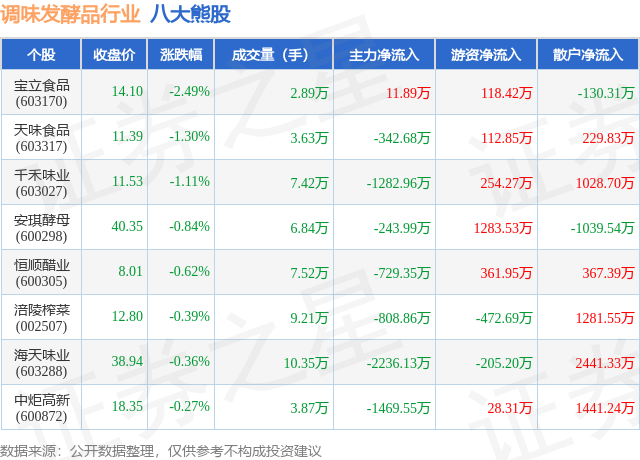 个股表现方面,调味发酵品行业当日领跌股为宝立食品(603170),该股当日报收14.1,下跌2.49%,成交量2.89万,主力资金净流入11.89万元。天味食品(603317)以下跌1.3%紧随其后,该股当日成交量3.63万,主力资金净流出342.68万元。除此之外,千禾味业(603027)、安琪酵母(600298)、恒顺醋业(600305)均进入当日熊股之列。具体个股列表见下表: