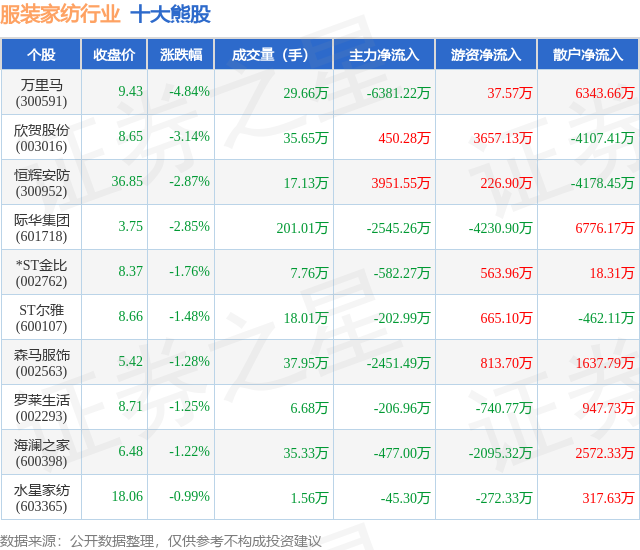 个股表现方面,服装家纺行业当日领跌股为万里马(300591),该股当日报收9.43,下跌4.84%,成交量29.66万,主力资金净流出6381.22万元。欣贺股份(003016)以下跌3.14%紧随其后,该股当日成交量35.65万,主力资金净流入450.28万元。除此之外,恒辉安防(300952)、际华集团(601718)、*ST金比(002762)均进入当日熊股之列。具体个股列表见下表: