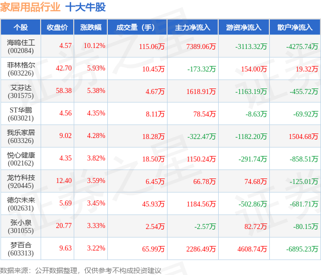 个股表现方面,家居用品行业当日领涨股为海鸥住工(002084),该股当日报收4.57,上涨10.12%,成交量115.06万,主力资金净流入7389.06万元。菲林格尔(603226)以上涨5.93%紧随其后,该股当日成交量10.45万,主力资金净流出173.32万元。除此之外,艾芬达(301575)、ST华鹏(603021)、我乐家居(603326)均进入当日牛股之列。具体个股列表见下表: