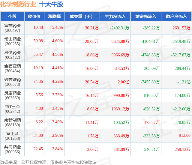 个股表现方面,化学制药行业当日领涨股为富祥药业(300497),该股当日报收10.48,上涨5.43%,成交量30.21万,主力资金净流出2402.31万元。常山药业(300255)以上涨4.6%紧随其后,该股当日成交量28.08万,主力资金净流入6624.08万元。除此之外,科伦药业(002422)、金石亚药(300434)、兴齐眼药(300573)均进入当日牛股之列。具体个股列表见下表: