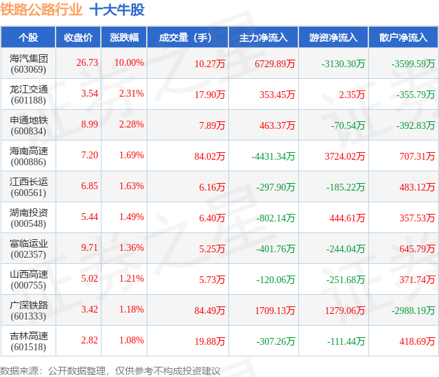 个股表现方面,铁路公路行业当日领涨股为海汽集团(603069),该股当日报收26.73,上涨10.0%,成交量10.27万,主力资金净流入6729.89万元。龙江交通(601188)以上涨2.31%紧随其后,该股当日成交量17.9万,主力资金净流入353.45万元。除此之外,申通地铁(600834)、海南高速(000886)、江西长运(600561)均进入当日牛股之列。具体个股列表见下表: