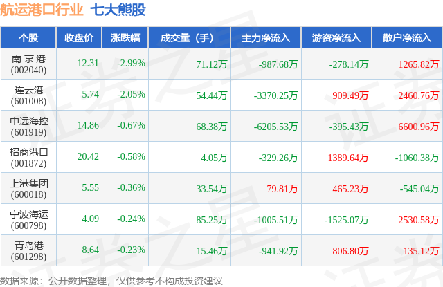 个股表现方面,航运港口行业当日领跌股为南 京 港(002040),该股当日报收12.31,下跌2.99%,成交量71.12万,主力资金净流出987.68万元。连云港(601008)以下跌2.05%紧随其后,该股当日成交量54.44万,主力资金净流出3370.25万元。除此之外,中远海控(601919)、招商港口(001872)、上港集团(600018)均进入当日熊股之列。具体个股列表见下表: