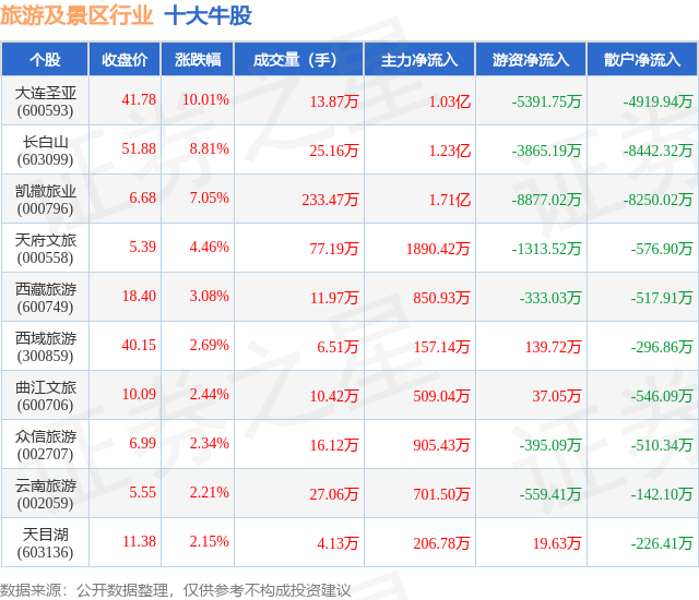 个股表现方面,旅游及景区行业当日领涨股为大连圣亚(600593),该股当日报收41.78,上涨10.01%,成交量13.87万,主力资金净流入1.03亿元。长白山(603099)以上涨8.81%紧随其后,该股当日成交量25.16万,主力资金净流入1.23亿元。除此之外,凯撒旅业(000796)、天府文旅(000558)、西藏旅游(600749)均进入当日牛股之列。具体个股列表见下表: