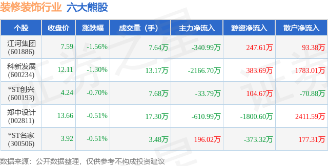 个股表现方面,装修装饰行业当日领跌股为江河集团(601886),该股当日报收7.59,下跌1.56%,成交量7.64万,主力资金净流出340.99万元。科新发展(600234)以下跌1.3%紧随其后,该股当日成交量13.17万,主力资金净流出2166.7万元。除此之外,*ST创兴(600193)、郑中设计(002811)、*ST名家(300506)均进入当日熊股之列。具体个股列表见下表: