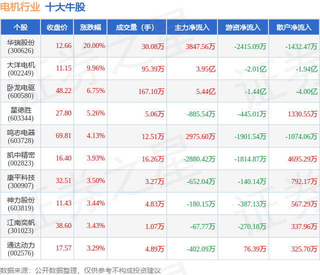 个股表现方面,电机行业当日领涨股为华瑞股份(300626),该股当日报收12.66,上涨20.0%,成交量30.08万,主力资金净流入3847.56万元。大洋电机(002249)以上涨9.96%紧随其后,该股当日成交量95.39万,主力资金净流入3.95亿元。除此之外,卧龙电驱(600580)、星德胜(603344)、鸣志电器(603728)均进入当日牛股之列。具体个股列表见下表: