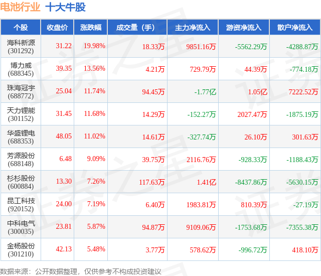 个股表现方面,电池行业当日领涨股为海科新源(301292),该股当日报收31.22,上涨19.98%,成交量18.33万,主力资金净流入9851.16万元。博力威(688345)以上涨13.56%紧随其后,该股当日成交量4.21万,主力资金净流入729.79万元。除此之外,珠海冠宇(688772)、天力锂能(301152)、华盛锂电(688353)均进入当日牛股之列。具体个股列表见下表: