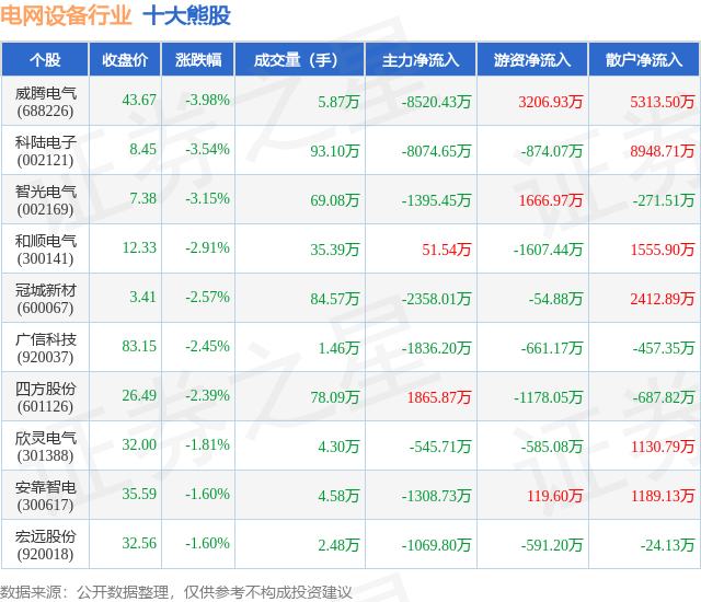 个股表现方面,电网设备行业当日领跌股为威腾电气(688226),该股当日报收43.67,下跌3.98%,成交量5.87万,主力资金净流出8520.43万元。科陆电子(002121)以下跌3.54%紧随其后,该股当日成交量93.1万,主力资金净流出8074.65万元。除此之外,智光电气(002169)、和顺电气(300141)、冠城新材(600067)均进入当日熊股之列。具体个股列表见下表: