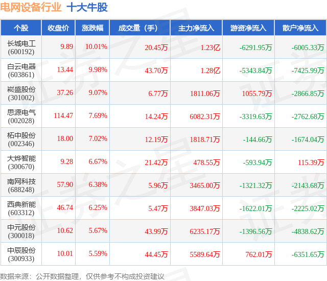 个股表现方面,电网设备行业当日领涨股为长城电工(600192),该股当日报收9.89,上涨10.01%,成交量20.45万,主力资金净流入1.23亿元。白云电器(603861)以上涨9.98%紧随其后,该股当日成交量43.7万,主力资金净流入1.28亿元。除此之外,崧盛股份(301002)、思源电气(002028)、柘中股份(002346)均进入当日牛股之列。具体个股列表见下表: