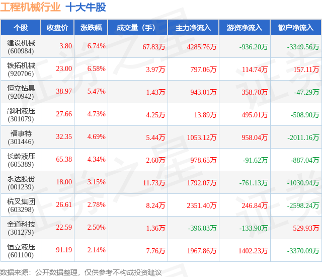 个股表现方面,工程机械行业当日领涨股为建设机械(600984),该股当日报收3.8,上涨6.74%,成交量67.83万,主力资金净流入4285.76万元。铁拓机械(920706)以上涨6.58%紧随其后,该股当日成交量3.97万,主力资金净流入797.06万元。除此之外,恒立钻具(920942)、邵阳液压(301079)、福事特(301446)均进入当日牛股之列。具体个股列表见下表:
