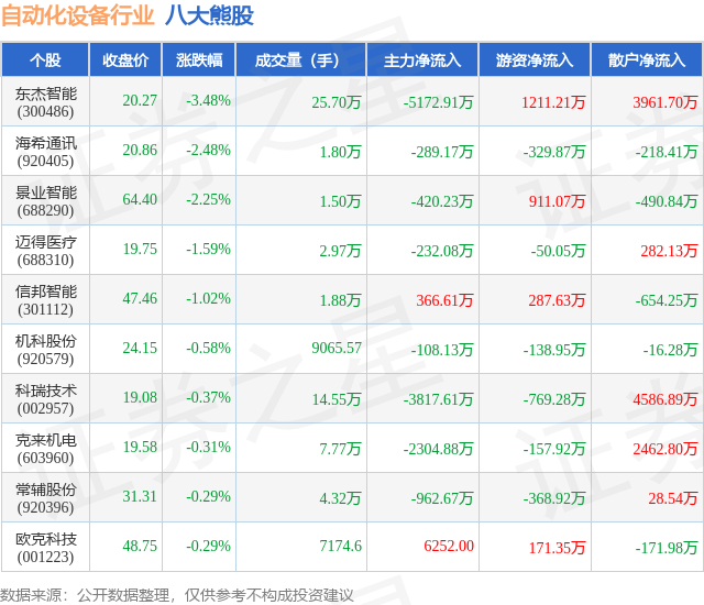 个股表现方面,自动化设备行业当日领跌股为东杰智能(300486),该股当日报收20.27,下跌3.48%,成交量25.7万,主力资金净流出5172.91万元。海希通讯(920405)以下跌2.48%紧随其后,该股当日成交量1.8万,主力资金净流出289.17万元。除此之外,景业智能(688290)、迈得医疗(688310)、信邦智能(301112)均进入当日熊股之列。具体个股列表见下表: