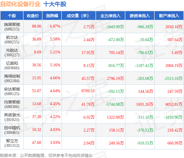 个股表现方面,自动化设备行业当日领涨股为瑞晟智能(688215),该股当日报收88.0,上涨6.87%,成交量2.75万,主力资金净流出1043.9万元。凯尔达(688255)以上涨5.58%紧随其后,该股当日成交量2.44万,主力资金净流出472.0万元。除此之外,光韵达(300227)、亿嘉和(603666)、海得控制(002184)均进入当日牛股之列。具体个股列表见下表: