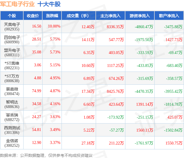 个股表现方面,军工电子行业当日领涨股为天奥电子(002935),该股当日报收16.5,上涨10.0%,成交量12.4万,主力资金净流入8336.35万元。四创电子(600990)以上涨5.75%紧随其后,该股当日成交量14.11万,主力资金净流入547.77万元。除此之外,盟升电子(688311)、*ST奥维(002231)、*ST万方(000638)均进入当日牛股之列。具体个股列表见下表: