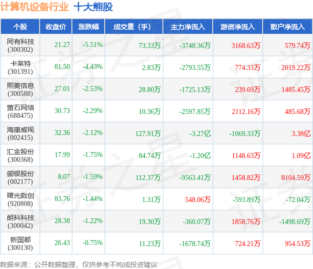 个股表现方面,计算机设备行业当日领跌股为同有科技(300302),该股当日报收21.27,下跌5.51%,成交量73.33万,主力资金净流出3748.36万元。卡莱特(301391)以下跌4.43%紧随其后,该股当日成交量2.83万,主力资金净流出2793.55万元。除此之外,熙菱信息(300588)、萤石网络(688475)、海康威视(002415)均进入当日熊股之列。具体个股列表见下表: