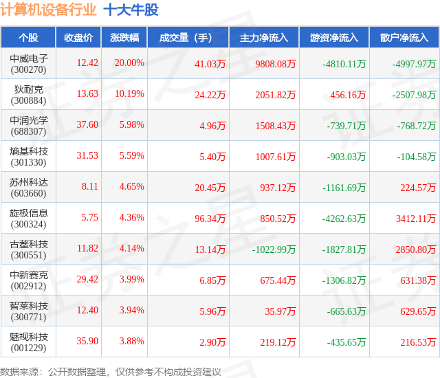 个股表现方面,计算机设备行业当日领涨股为中威电子(300270),该股当日报收12.42,上涨20.0%,成交量41.03万,主力资金净流入9808.08万元。狄耐克(300884)以上涨10.19%紧随其后,该股当日成交量24.22万,主力资金净流入2051.82万元。除此之外,中润光学(688307)、熵基科技(301330)、苏州科达(603660)均进入当日牛股之列。具体个股列表见下表: