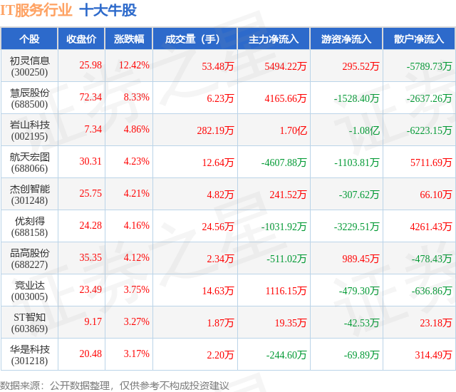 个股表现方面,IT服务行业当日领涨股为初灵信息(300250),该股当日报收25.98,上涨12.42%,成交量53.48万,主力资金净流入5494.22万元。慧辰股份(688500)以上涨8.33%紧随其后,该股当日成交量6.23万,主力资金净流入4165.66万元。除此之外,岩山科技(002195)、航天宏图(688066)、杰创智能(301248)均进入当日牛股之列。具体个股列表见下表: