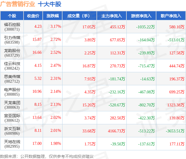 个股表现方面,广告营销行业当日领涨股为福石控股(300071),该股当日报收4.23,上涨3.17%,成交量17.05万,主力资金净流入455.12万元。引力传媒(603598)以上涨2.72%紧随其后,该股当日成交量3.89万,主力资金净流入677.05万元。除此之外,龙韵股份(603729)、佳云科技(300242)、思美传媒(002712)均进入当日牛股之列。具体个股列表见下表: