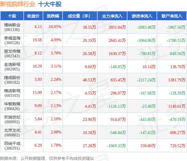 个股表现方面,影视院线行业当日领涨股为博纳影业(001330),该股当日报收6.13,上涨10.05%,成交量58.55万,主力资金净流入3951.04万元。幸福蓝海(300528)以上涨4.09%紧随其后,该股当日成交量20.19万,主力资金净流入2845.41万元。除此之外,慈文传媒(002343)、金逸影视(002905)、捷成股份(300182)均进入当日牛股之列。具体个股列表见下表: