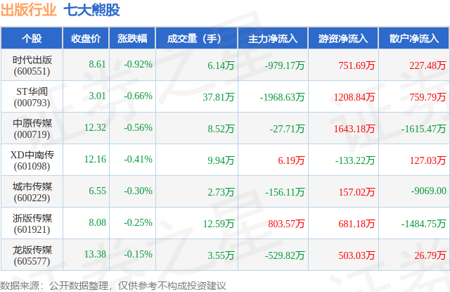 个股表现方面,出版行业当日领跌股为时代出版(600551),该股当日报收8.61,下跌0.92%,成交量6.14万,主力资金净流出979.17万元。ST华闻(000793)以下跌0.66%紧随其后,该股当日成交量37.81万,主力资金净流出1968.63万元。除此之外,中原传媒(000719)、XD中南传(601098)、城市传媒(600229)均进入当日熊股之列。具体个股列表见下表: