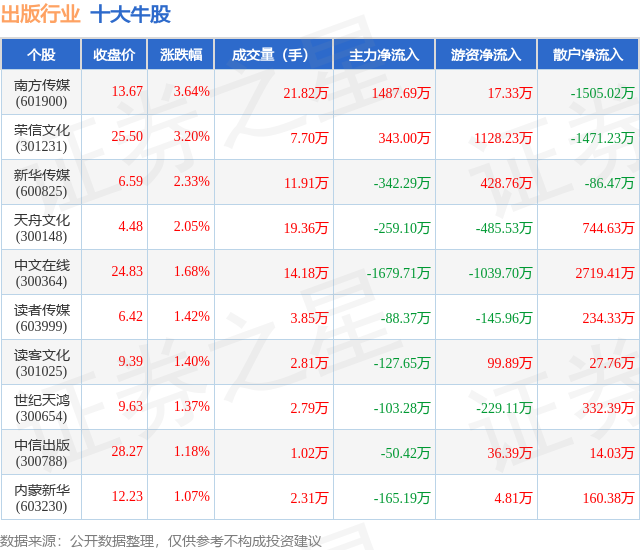 个股表现方面,出版行业当日领涨股为南方传媒(601900),该股当日报收13.67,上涨3.64%,成交量21.82万,主力资金净流入1487.69万元。荣信文化(301231)以上涨3.2%紧随其后,该股当日成交量7.7万,主力资金净流入343.0万元。除此之外,新华传媒(600825)、天舟文化(300148)、中文在线(300364)均进入当日牛股之列。具体个股列表见下表: