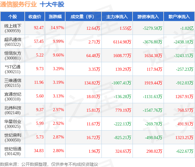 个股表现方面,通信服务行业当日领涨股为线上线下(300959),该股当日报收92.47,上涨14.97%,成交量12.64万,主力资金净流入1.55亿元。超讯通信(603322)以上涨9.99%紧随其后,该股当日成交量2.71万,主力资金净流入6114.98万元。除此之外,恒信东方(300081)、*ST亿通(300211)、三维通信(002115)均进入当日牛股之列。具体个股列表见下表: