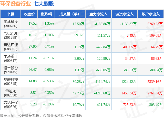 个股表现方面,环保设备行业当日领跌股为国林科技(300786),该股当日报收17.52,下跌1.35%,成交量17.5万,主力资金净流出4138.86万元。*ST清研(301288)以下跌1.1%紧随其后,该股当日成交量5916.0,主力资金净流出111.57万元。除此之外,青达环保(688501)、宇通重工(600817)、恒合股份(920145)均进入当日熊股之列。具体个股列表见下表: