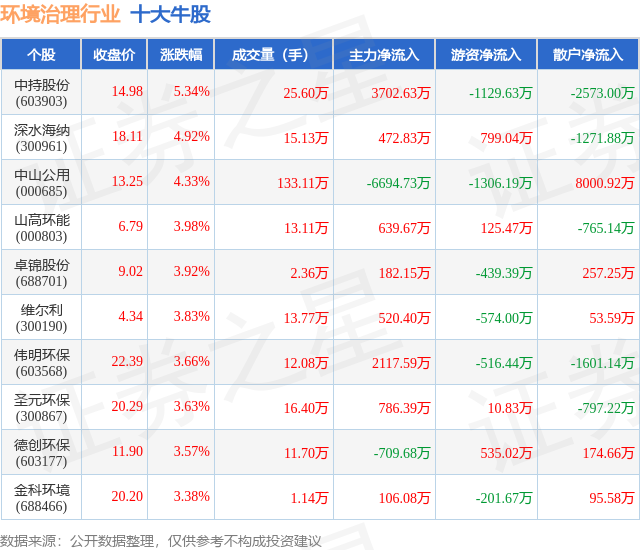 个股表现方面,环境治理行业当日领涨股为中持股份(603903),该股当日报收14.98,上涨5.34%,成交量25.6万,主力资金净流入3702.63万元。深水海纳(300961)以上涨4.92%紧随其后,该股当日成交量15.13万,主力资金净流入472.83万元。除此之外,中山公用(000685)、山高环能(000803)、卓锦股份(688701)均进入当日牛股之列。具体个股列表见下表: