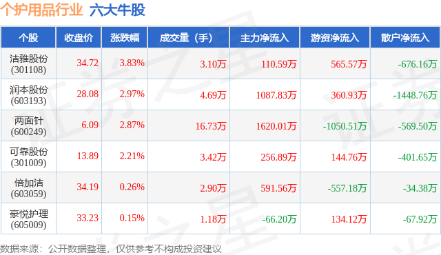 个股表现方面,个护用品行业当日领涨股为洁雅股份(301108),该股当日报收34.72,上涨3.83%,成交量3.1万,主力资金净流入110.59万元。润本股份(603193)以上涨2.97%紧随其后,该股当日成交量4.69万,主力资金净流入1087.83万元。除此之外,两面针(600249)、可靠股份(301009)、倍加洁(603059)均进入当日牛股之列。具体个股列表见下表: