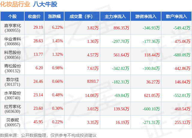 个股表现方面,化妆品行业当日领涨股为嘉亨家化(300955),该股当日报收29.19,上涨6.22%,成交量3.82万,主力资金净流入896.35万元。华业香料(300886)以上涨1.45%紧随其后,该股当日成交量1.3万,主力资金净流出297.7万元。除此之外,科思股份(300856)、青松股份(300132)、敷尔佳(301371)均进入当日牛股之列。具体个股列表见下表: