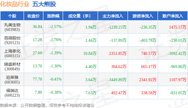 个股表现方面,化妆品行业当日领跌股为丸美生物(603983),该股当日报收36.84,下跌2.57%,成交量1.94万,主力资金净流出1239.23万元。芭薇股份(920123)以下跌1.76%紧随其后,该股当日成交量1.44万,主力资金净流出137.89万元。除此之外,上海家化(600315)、锦盛新材(300849)、珀莱雅(603605)均进入当日熊股之列。具体个股列表见下表: