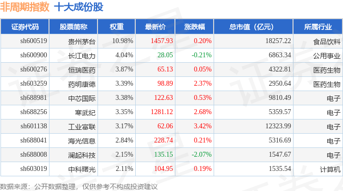 证券之星消息,10月20日,非周期(000064)指数报收于3613.35点,涨0.35%,成交1616.83亿元,换手率0.85%。当日该指数成份股中,上涨的有56家,士兰微以8.65%的涨幅领涨,下跌的有44家,片仔癀以4.71%的跌幅领跌。
