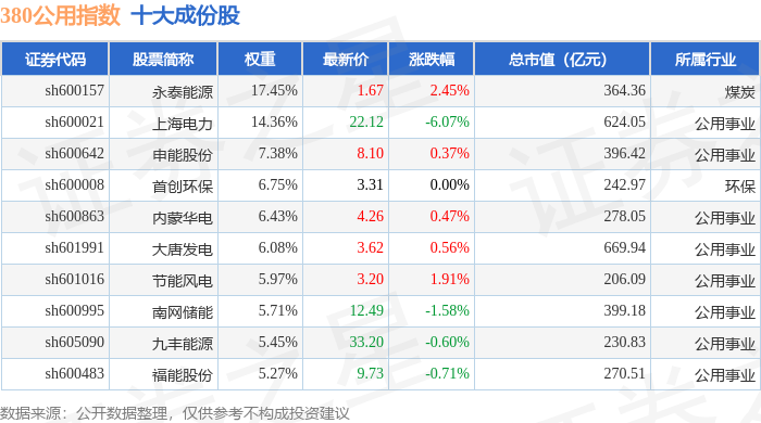 证券之星消息,10月20日,380公用(000113)指数报收于3047.75点,跌0.39%,成交77.45亿元,换手率1.9%。当日该指数成份股中,上涨的有9家,永泰能源以2.45%的涨幅领涨,下跌的有4家,上海电力以6.07%的跌幅领跌。