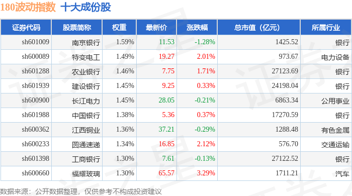证券之星消息,10月20日,180波动(000129)指数报收于15333.82点,涨0.16%,成交1071.74亿元,换手率0.45%。当日该指数成份股中,上涨的有53家,潞安环能以7.23%的涨幅领涨,下跌的有46家,山东黄金以6.34%的跌幅领跌。