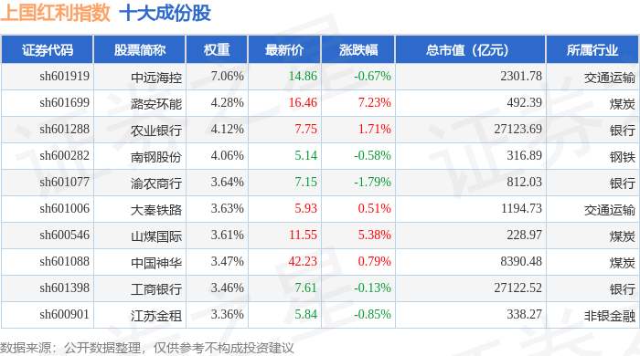 证券之星消息,10月20日,上国红利(000151)指数报收于1602.62点,涨1.36%,成交298.5亿元,换手率0.31%。当日该指数成份股中,上涨的有20家,平煤股份以9.1%的涨幅领涨,下跌的有10家,江苏银行以1.82%的跌幅领跌。