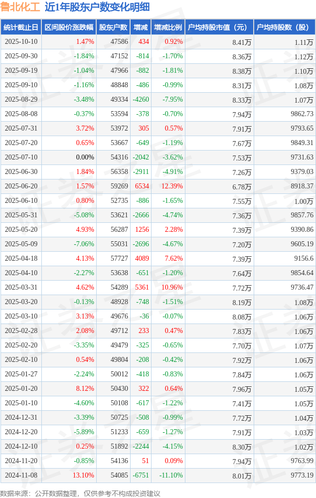 从股价来看,2025年9月30日至2025年10月10日,鲁北化工区间涨幅为1.47%,在此期间股东户数增加434.0户,增幅为0.92%。