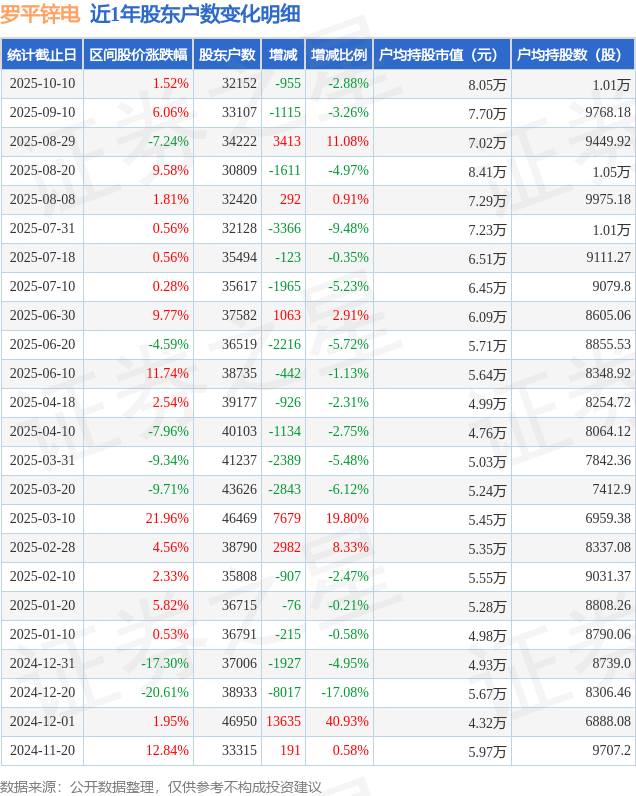 从股价来看,2025年9月10日至2025年10月10日,罗平锌电区间涨幅为1.52%,在此期间股东户数减少955.0户,减幅为2.88%。