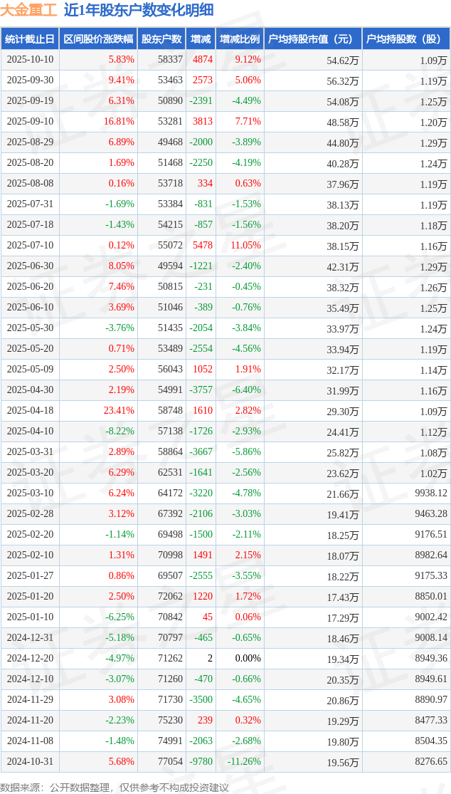 从股价来看,2025年9月19日至2025年10月10日,大金重工区间涨幅为15.78%,在此期间股东户数增加7447.0户,增幅为14.63%。