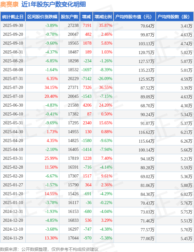从股价来看,2025年9月20日至2025年9月30日,奥赛康区间跌幅为3.89%,在此期间股东户数增加7191.0户,增幅为35.87%。
