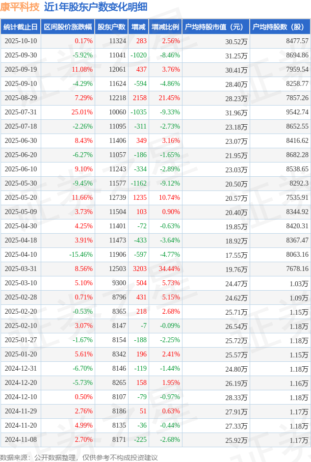 从股价来看,2025年9月30日至2025年10月10日,康平科技区间涨幅为0.17%,在此期间股东户数增加283.0户,增幅为2.56%。