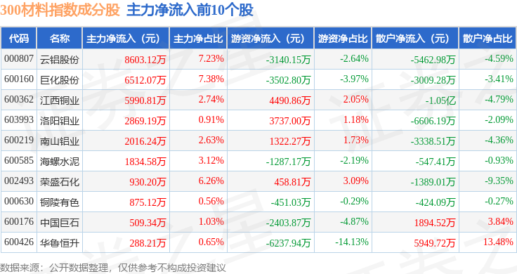 资金流向方面,300材料(000909)指数成份股当日主力资金净流出合计30.35亿元,游资资金净流入合计1.88亿元,散户资金净流入合计28.47亿元。成份股资金流向详情见下表: