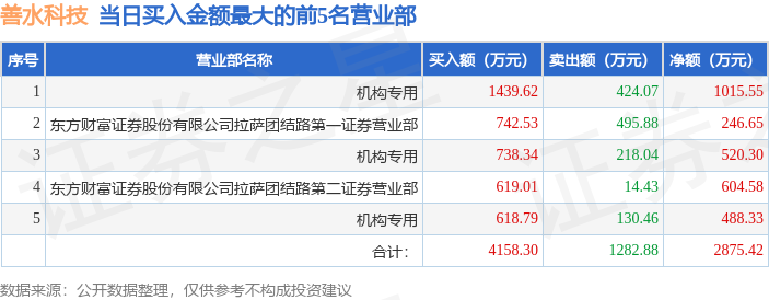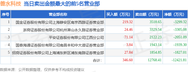 证券之星消息,沪深交易所2025年10月20日公布的交易公开信息显示,善水科技(301190)因日跌幅达到15%的前5只证券登上龙虎榜。此次是近5个交易日内第1次上榜。