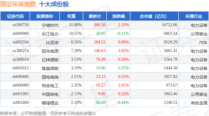 证券之星消息,10月20日,国证环保(399358)指数报收于5395.44点,涨0.79%,成交763.2亿元,换手率1.11%。当日该指数成份股中,上涨的有22家,晶盛机电以3.55%的涨幅领涨,下跌的有18家,隆基绿能以3.25%的跌幅领跌。