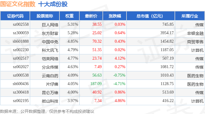 证券之星消息,10月20日,国证文化(399397)指数报收于2222.92点,涨0.43%,成交306.22亿元,换手率1.67%。当日该指数成份股中,上涨的有34家,岩山科技以4.86%的涨幅领涨,下跌的有13家,国联股份以6.46%的跌幅领跌。