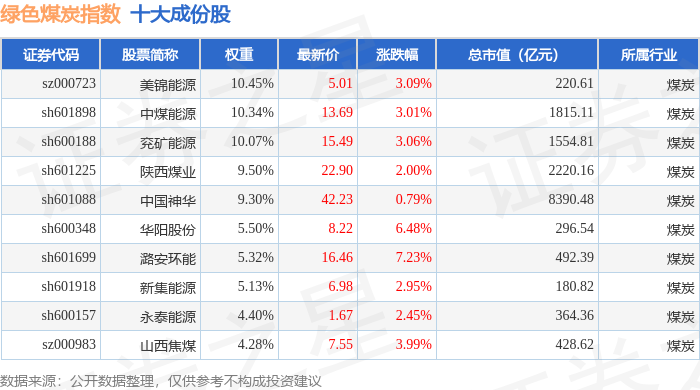 证券之星消息,10月20日,绿色煤炭(399436)指数报收于4241.39点,涨3.46%,成交204.47亿元,换手率2.66%。当日该指数成份股中,上涨的有27家,郑州煤电以10.1%的涨幅领涨。