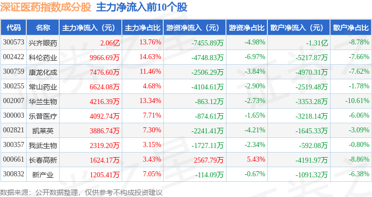 资金流向方面,深证医药(399618)指数成份股当日主力资金净流入合计2802.71万元,游资资金净流出合计2.75亿元,散户资金净流入合计2.47亿元。成份股资金流向详情见下表: