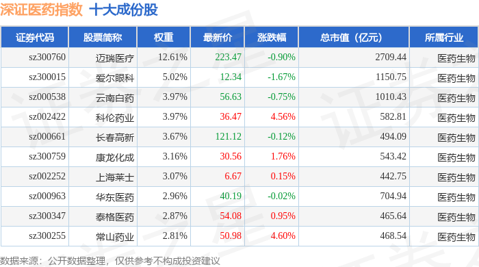 证券之星消息,10月20日,深证医药(399618)指数报收于8548.62点,涨0.21%,成交200.67亿元,换手率1.14%。当日该指数成份股中,上涨的有32家,我武生物以10.07%的涨幅领涨,下跌的有24家,亿帆医药以4.45%的跌幅领跌。