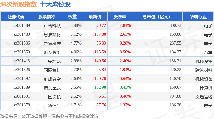深次新股(399678)指数十大成份股详情如下: